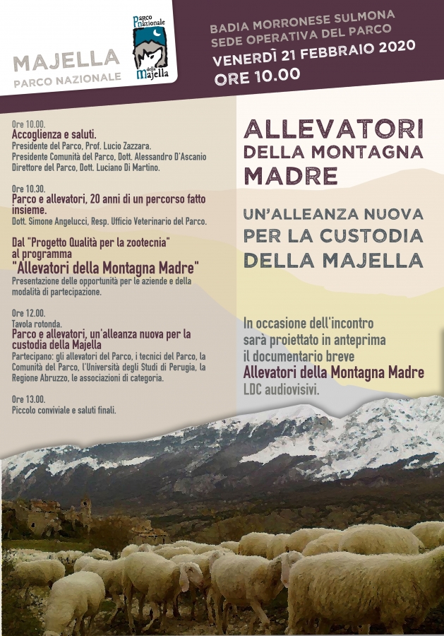 Venerdì 21 Febbraio, alle ore 10, presso la Sede Operativa del Parco di Badia Morronese in Sulmona (Aq) verrà presentato il programma “Allevatori della Montagna Madre” che vede raccolte e sviluppate tutte le iniziative intraprese da parte dell’Ente Parco Nazionale della Majella a favore della zootecnia sostenibile. Interverranno il Presidente del Parco Lucio Zazzara, il Presidente della Comunità del Parco Alessandro D’Ascanio, il Direttore Luciano Di Martino, il Veterinario del Parco Simone Angelucci, gli “Allevatori della Montagna Madre”, le Associazioni di categoria. Confermata la presenza del Presidente della Regione Abruzzo, Marco Marsilio. Durante l’incontro, inoltre, sarà proiettato il documentario breve dal titolo “Allevatori della Montagna Madre”.