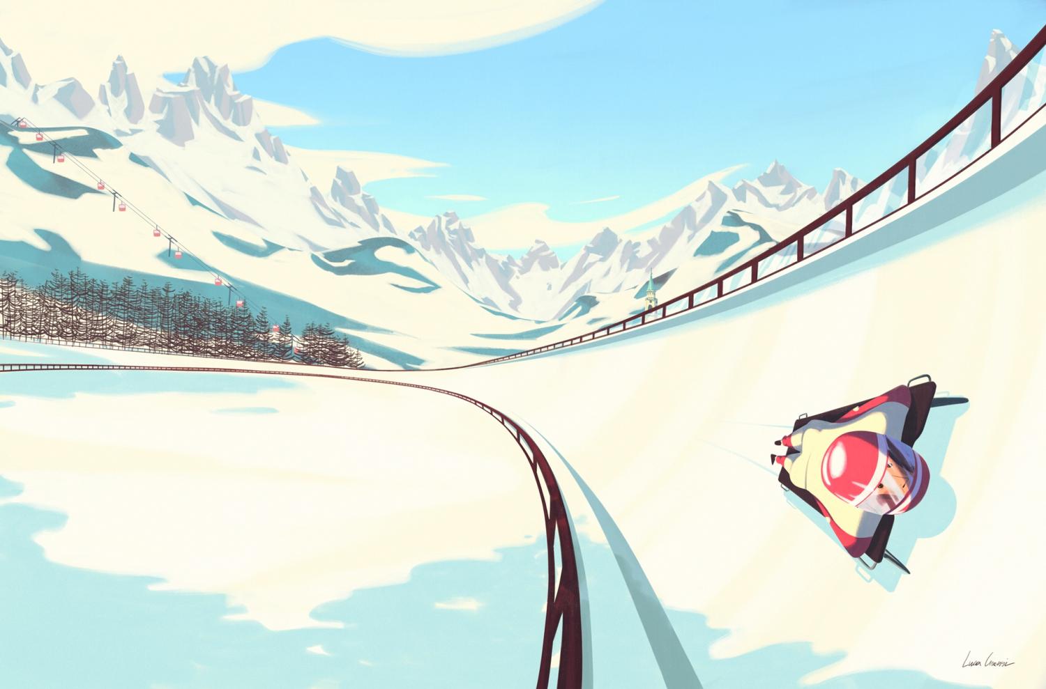 Il bob ha un fratello più piccolo: lo slittino, una freccia solitaria, un atleta solo, supino, in una pista che diventa una spirale di ghiaccio che sussurra promesse e pericoli.