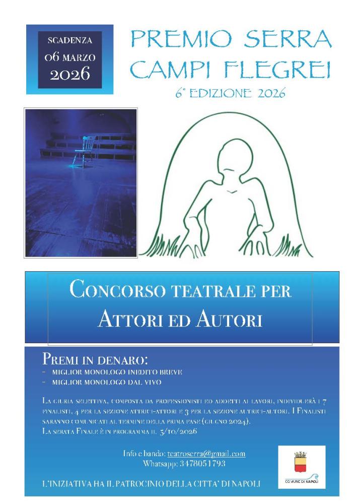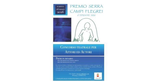 Con il nuovo anno si apre il bando del Premio Nazionale “Serra-Campi Flegrei” alla vocazione teatrale nella disciplina del monologo breve giunto alla sesta edizione. Indetto dal Teatro Serra e patrocinato dalla Città di Napoli, si rivolge ad artisti professionisti e non, senza limiti d’età. Due le sezioni di concorso: Attrici/Attori e Autrici/Autori. Incartamento disponibile su dramma.it e sipario.it. Iscrizioni fino a venerdì 6 marzo 2026. Info: teatroserra@gmail.com, 347.8051793.