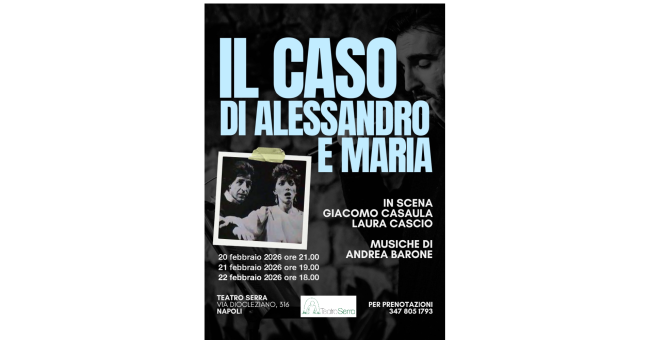 Giacomo Casaula e Laura Cascio, con Andrea Barone alle tastiere, protagonisti al Teatro Serra di Napoli, con “Il caso di Alessandro e Maria-Curiosa replica di una storia che ha già avuto luogo”. Una commedia di Giorgio Gaber e Sandro Luporini. Dal 20 al 22 febbraio a Fuorigrotta, Via Diocleziano 316, (venerdì ore 21:00, sabato ore 19:00, domenica ore 18:00). Info: teatroserra@gmail.com, 347.8051793.