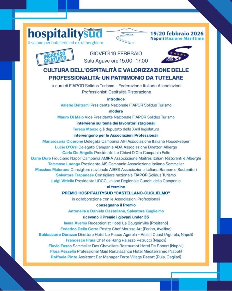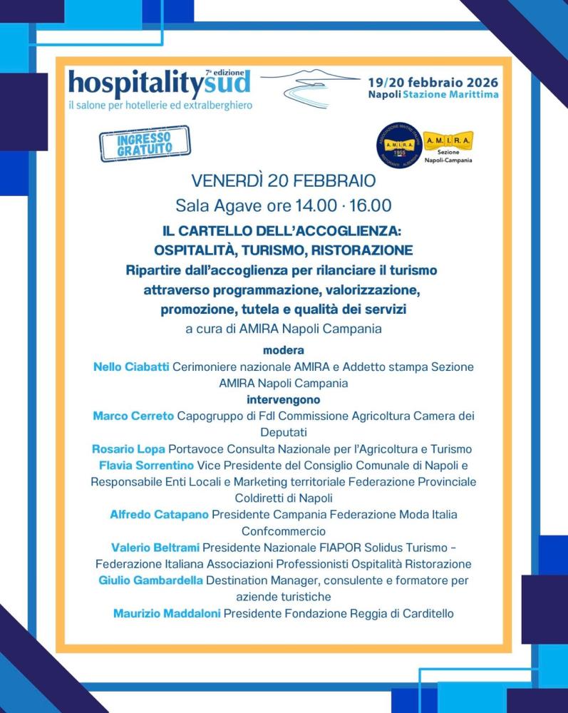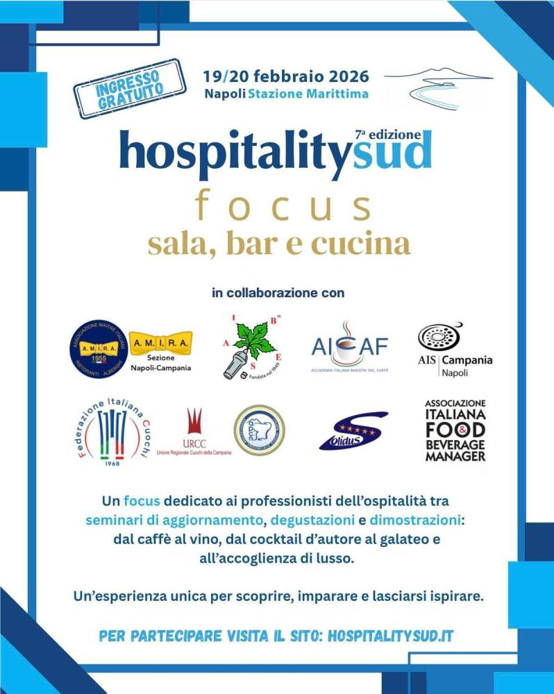 Si è conclusa con grande partecipazione l’edizione 2026 di HospitalitySud, organizzata da Ugo Picarelli, tenutasi il 19 e 20 febbraio presso la Stazione Marittima di Napoli, confermandosi uno degli appuntamenti più rilevanti del Centro-Sud dedicati al mondo dell’ospitalità professionale.