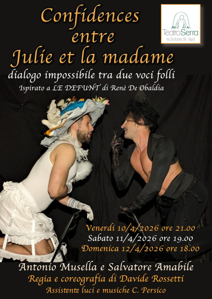 Con “Les confidences entre Julie et la madame” dialogo impossibile a due voci folli, approda al Teatro Serra di Napoli una satira dell’assurdo, liberamente ispirata a “Le défunt” di René de Obaldia. Una produzione “Il nudo dell’anima” per la regia di Davide Rossetti con Salvatore Amabile e Antonio Musella. A Fuorigrotta, in Via Diocleziano 316 dal 10 al 12 aprile (venerdì ore 21:00, sabato ore 19:00, domenica ore 18:00). Info: teatroserra@gmail.com; 347.8051793.