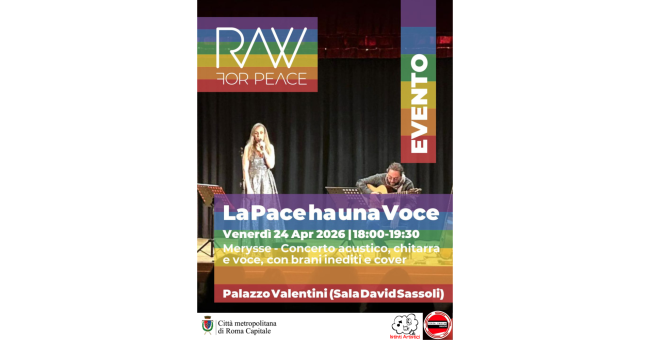 Venerdì 24 aprile alle ore 18:00 la Sala David Sassoli di Palazzo Valentini, a Roma, ospiterà La Pace ha una Voce, il concerto della cantautrice Merysse inserito nel programma di RAW for Peace, la giornata speciale promossa nell’ambito di Rome Art Week e dedicata al dialogo culturale attraverso le arti.