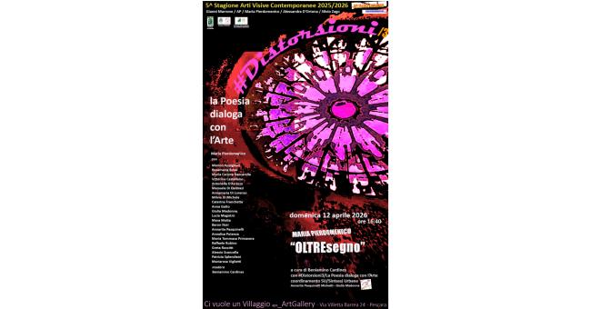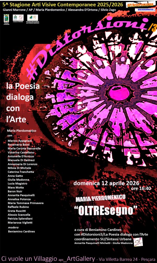 Domenica 12 aprile ore 16:40, terzo appuntamento con il progetto #DISTORSIONI/3 – La Poesia dialoga con l’arte nell’ambito della 5^ Stagione Arti Visive Contemporanee presso “Ci vuole un villaggio aps_ArtGallery” (Via Villetta Barrea 24 - Pescara). Patrocino della Presidenza del Consiglio Regionale – Regione Abruzzo. Patrocinio del Comune di Pescara e della Provincia di Pescara.