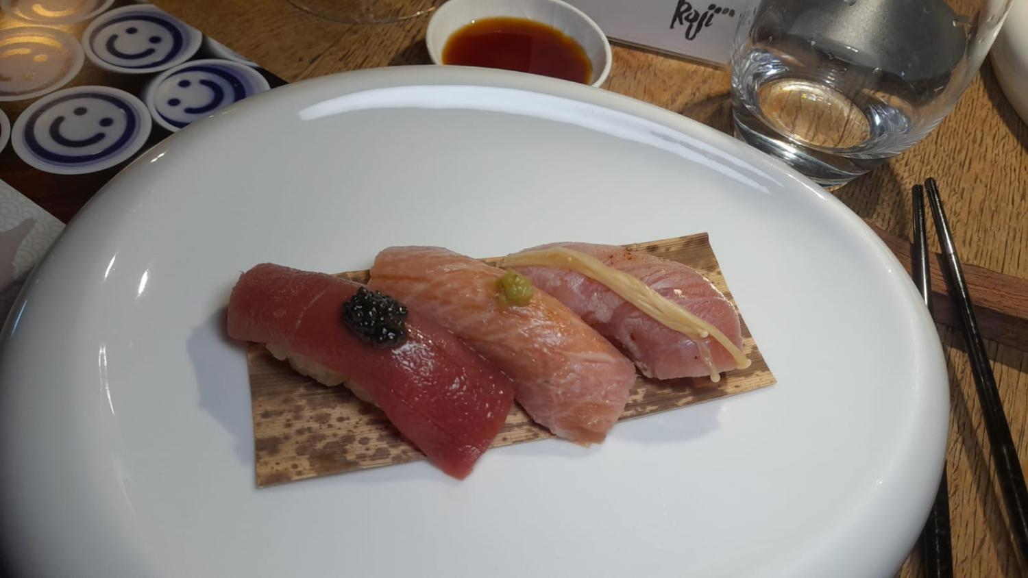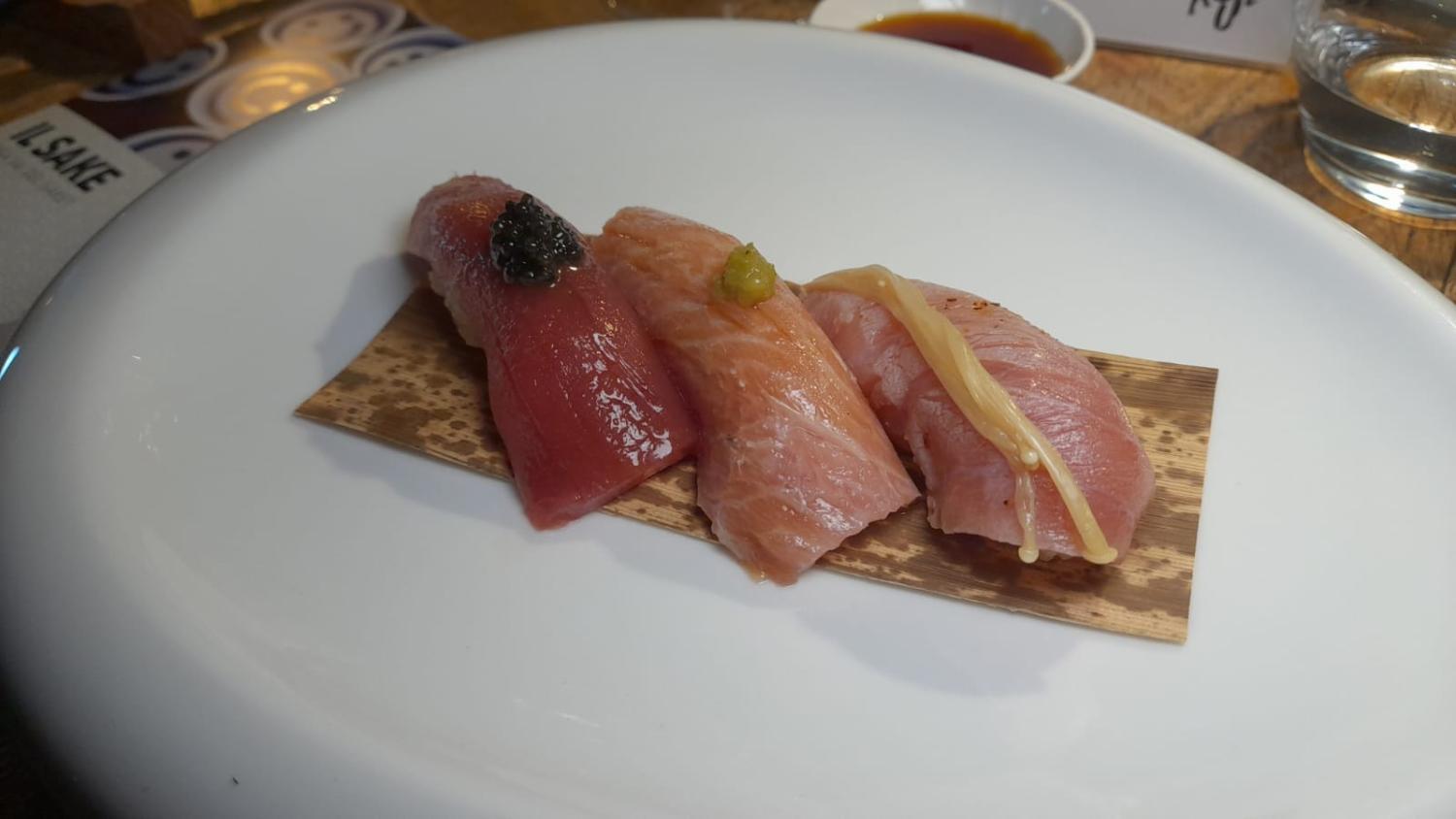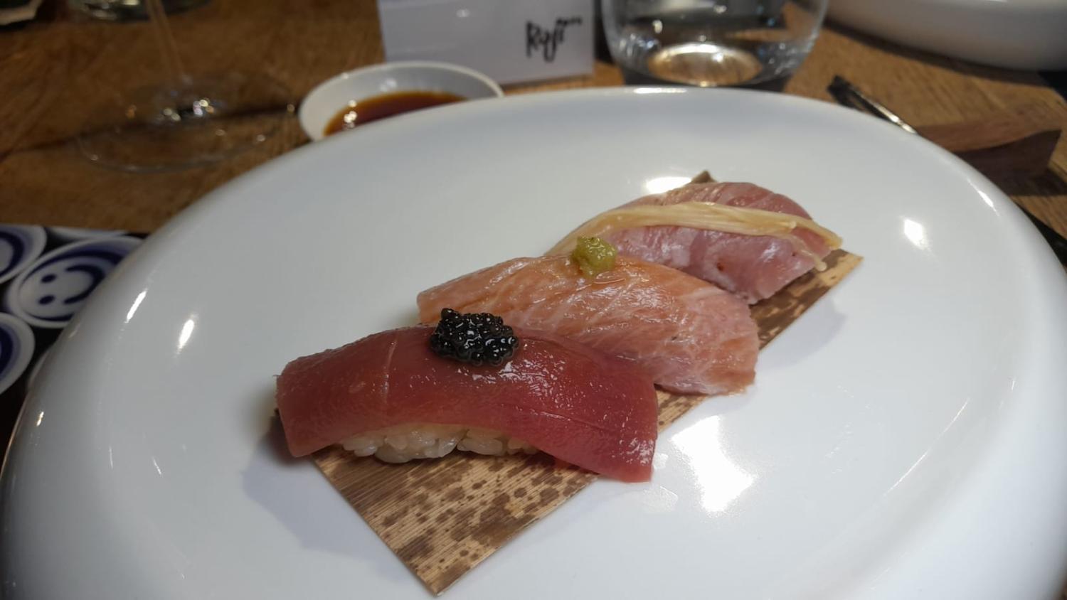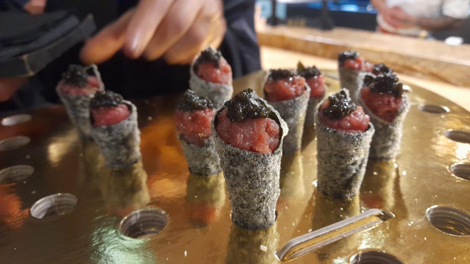 La degustazione successiva è un viaggio sinfonico nel tonno Balfegó. Si parte dalla Nakaochi, tartare estratta dalla lisca che cattura l'essenza iodata del mare. Seguono creazioni fusion come shiso in tempura con tartare e caviale, carpacci trasparenti, chutoro affumicato. Il menu kaiseki propone sashimi selezionati, nigiri impeccabili e temaki rivisitati, culminando in signature come ossobuco di Wagyu con tartare di tonno e costata alla robata. Artisti marziali e ritmi di tamburi taiko incorniciano il tutto, mentre sake premium come Heavensake e whisky Fuji Sanroku creano pairing equilibrati.