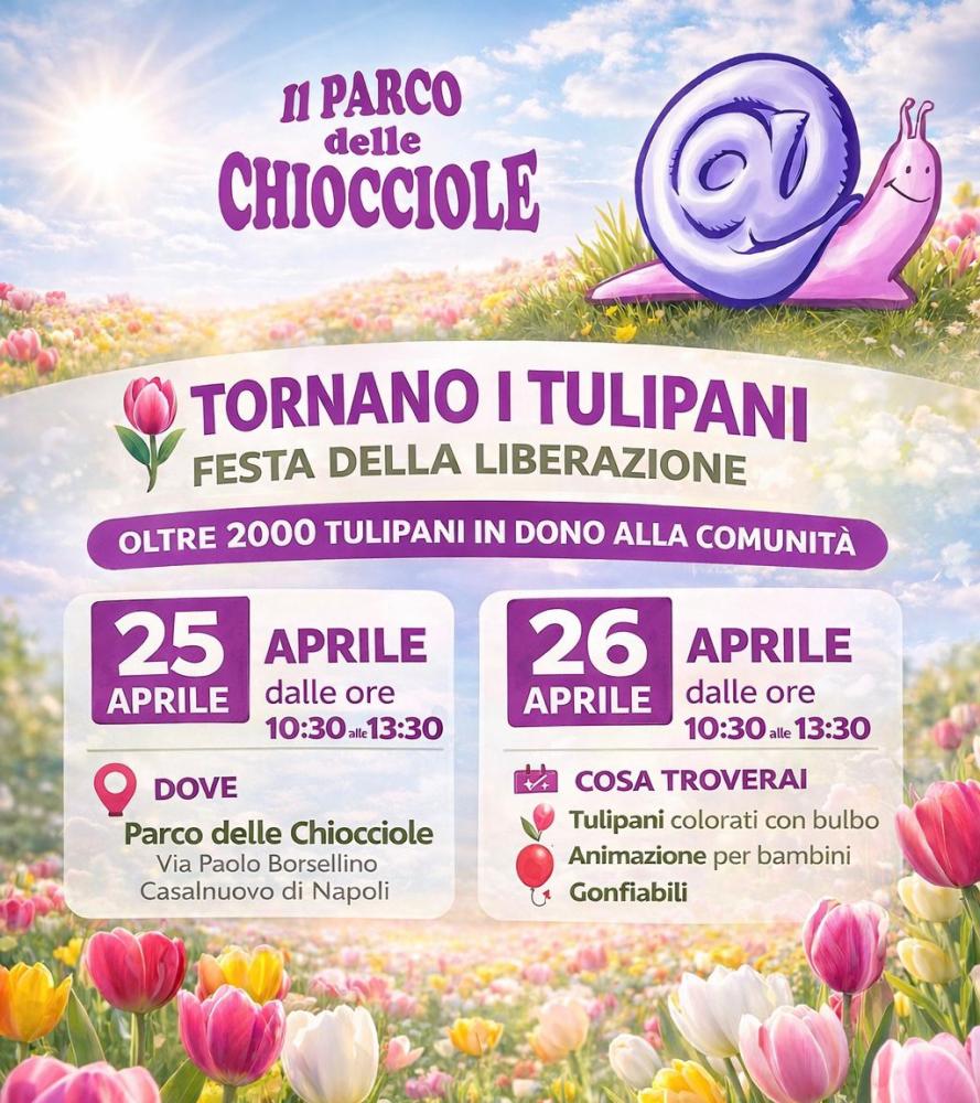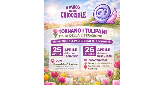 Sabato 25 e domenica 26 aprile, presso il Parco delle Chiocciole, sito in via Paolo Borsellino, saranno donati oltre duemila tulipani colorati, confezionati con il loro bulbo, come simbolo di rinascita, condivisione e partecipazione.