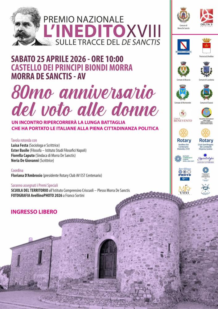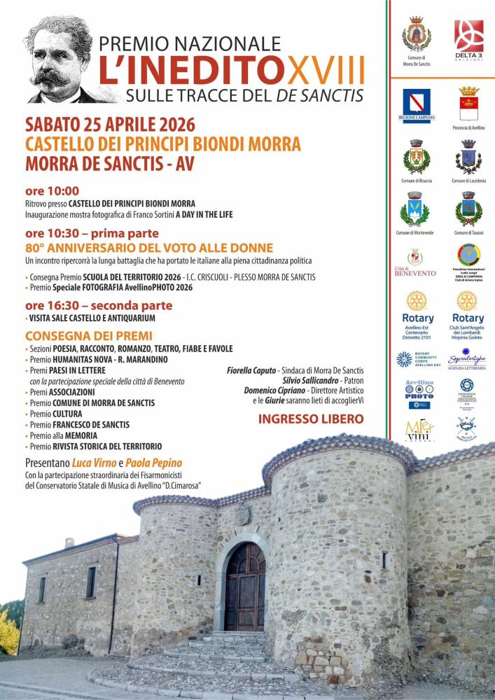 Sabato 25 aprile 2026 a Morra de Sanctis (Avellino) si svolge la XVIII edizione del Premio Nazionale L’Inedito sulle Tracce del De Sanctis, con un programma che copre l’intera giornata al Castello dei Principi Biondi Morra. L’ingresso è libero e le attività iniziano dalle ore 10:00.