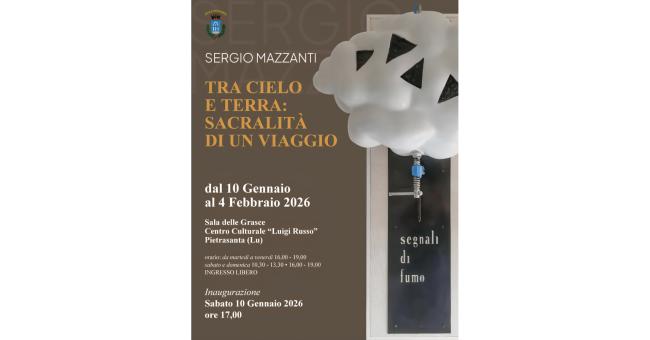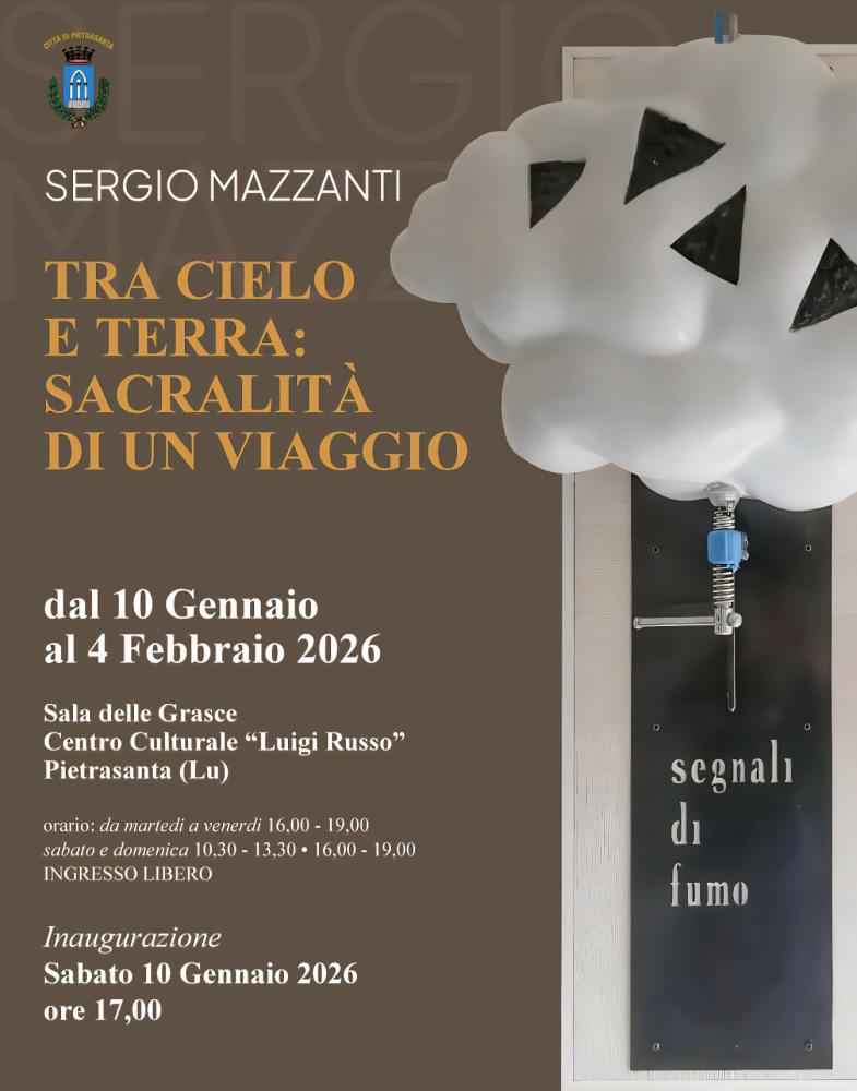 È un dialogo sottile tra materia e spiritualità quello che attraversa "Tra cielo e terra: sacralità di un viaggio", la mostra d'arte personale di Sergio Mazzanti ospitata alla Sala delle Grasce del Centro culturale “Luigi Russo” di Pietrasanta, visitabile fino al 4 febbraio 2026. Un progetto espositivo che invita lo spettatore a interrogarsi sul rapporto tra uomo e ambiente, tra responsabilità etica e tensione ecologica.