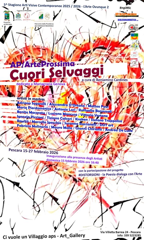 Domenica 15 febbraio 2026 dalle ore 16:40, inaugurazione di “Cuori Selvaggi” mostra collettiva con oltre 20 artisti di nuova pittura italiana contemporanea. La mostra si terrà presso “Ci vuole un villaggio aps_ArtGallery” (Via Villetta Barrea 24 - Pescara), proseguirà fino alla fine di febbraio 2026. Promossa da Bibliodrammatica aps e AP/ArteProssima progetto #npittic, direzione artistica curatoriale Beniamino Cardines, nell’ambito di “L’Arte Ovunque 2” 5^ Stagione di Arti Visive Contemporanee.
