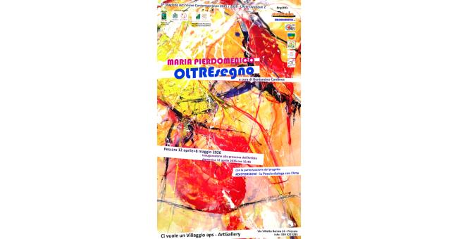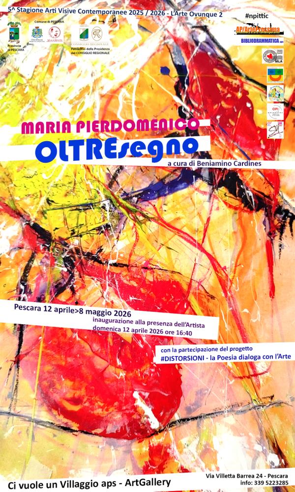 Domenica 12 aprile dalle ore 16:40, inaugurazione di “OLTREsegno” mostra personale di Maria Pierdomenico, artista visiva abruzzese di grande impatto visivo. La mostra si terrà presso “Ci vuole un villaggio aps_ArtGallery” (Via Villetta Barrea 24 - Pescara), proseguirà fino a maggio 2026. Promossa da Bibliodrammatica aps e AP/ArteProssima progetto #npittic, direzione artistica curatoriale Beniamino Cardines, nell’ambito di “L’Arte Ovunque 2” 5^ Stagione di Arti Visive Contemporanee, col Patrocinio della Presidenza del Consiglio Regionale, Patrocinio del Comune di Pescara e della Provincia di Pescara. Un progetto di promozione scoperta e sensibilizzazione sulla nuova pittura italiana.