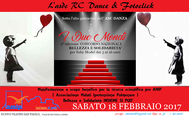 Con il patrocinio dell’Ente di promozione sportiva ‘ASC DANZA’ riconosciuto dal CONI , l’A S C RC Dance e l’art director di Fotoclick organizzano la seconda edizione del Concorso Nazionale di bellezza “I 2 MONDI ”, aperto a tutti i bambini di età compresa tra i 3 e 16 anni. L’evento avrà luogo sabato 18 febbraio 2017 e si svolgerà in un’ unica tappa presso il ‘Nuovo Teatro San Paolo’, viale di San Paolo 12, Roma. “I 2 MONDI ”1°concorso nazionale unico nel suo genere che unisce insieme bellezza e solidarietà, nasce con l’intento di far conoscere un’associazione onlus, l’AMIP (associazione malati di ipertensione polmonare) e per dare un’interessante opportunità a tutti i baby model di farsi notare, ma soprattutto divertirsi.