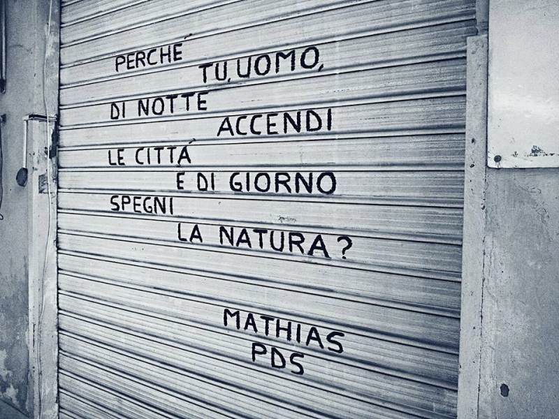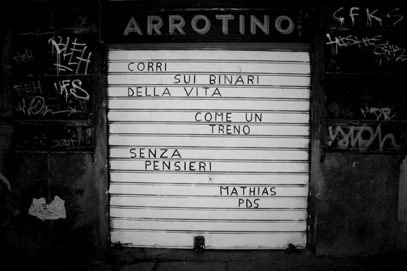 M. P.D.S.: Prima di passare alla poesia di strada, ho avuto modo di sperimentare svariate tecniche che ho accantonato e riconsiderato nel corso del tempo. Le prime impronte poetiche che ho lasciato sui muri risalgono a non molto tempo fa, in seguito a un processo di “metamorfosi artistica” che, a quanto pare, ha capovolto le mie ambizioni, spingendomi alla ricerca di una espressione, se vogliamo primitiva, che mi permettesse di esprimere metaforicamente contenuti mediante l'utilizzo di poche, semplici parole.