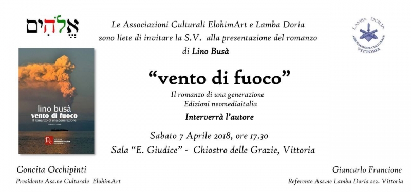 Un altro libro, un altro grande autore; questa volta a fare informazione sarà il libro del messinese Lino Busà, “Vento di fuoco”, il romanzo di una generazione edito per i tipi della Neomediaitalia e che sarà presentato sabato 07 aprile 2018 presso la sala “E. Giudice” al complesso delle Grazie.