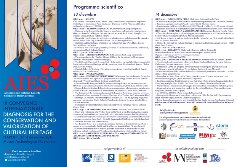 Accademici di vari atenei nazionali, aziende di settore, esperti scientifici del patrimonio culturale e studenti anche quest’anno si riuniranno a Napoli e precisamente al MANN per lo storico convegno organizzato da AIES – Associazione Italiana Esperti Scientifici Beni Culturali, in collaborazione con il MANN, con il Polo Museale Sapienza e con ANEDBC Associazione Nazionale Esperti di Diagnostica e di scienze e tecnologie applicate ai Beni Culturali. L’evento gode del patrocinio del MiBAC ed è stato inserito tra gli eventi 2018 Anno Europeo del Patrimonio Culturale #EuropeForCulture.