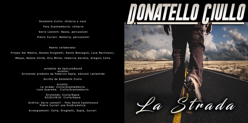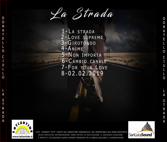 In LA STRADA, Donatello Ciullo si discosta un po’ da quello che è il suo filone musicale storico e propone brani completamente diversi. Un mix di rock, elettronica, acid jazz in otto canzoni di cui sei nuove che insieme ai suoi ultimi due singoli Anime e Gatto completano la sua ultima fatica discografica.