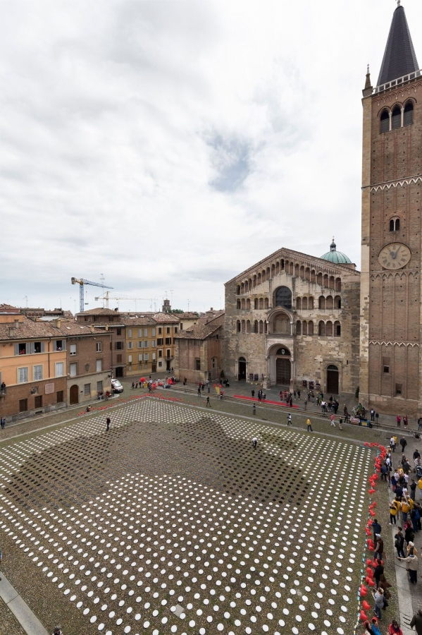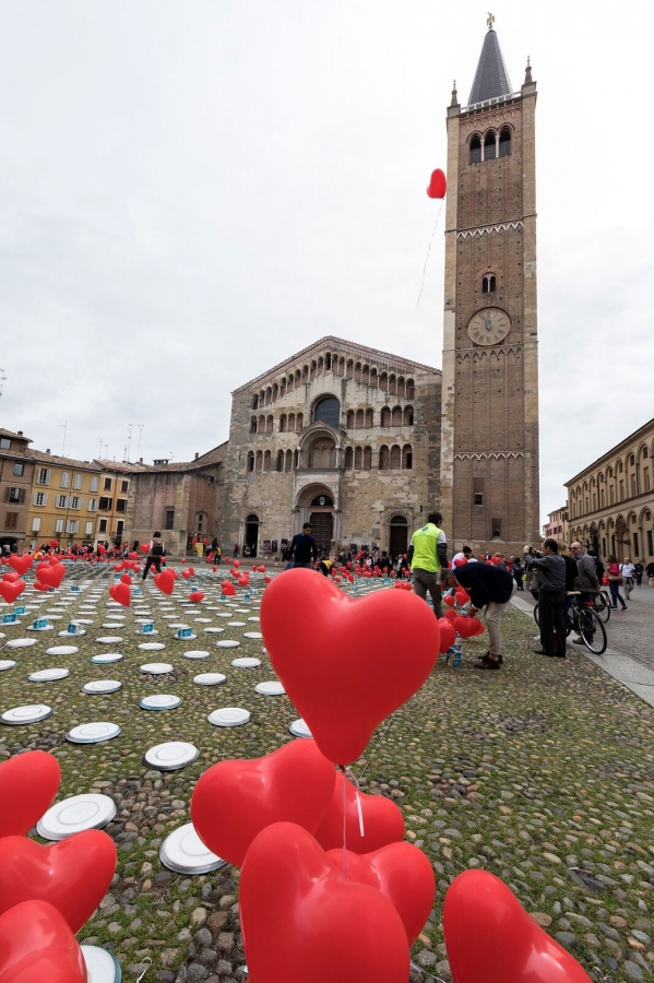 10 mila piatti “vuoti” da riempire. Oltre 5 mila palloncini rossi a forma di cuore. Un grande spazio pubblico, simbolo dell’Italia: Piazza Duomo a Parma. Questa la ricetta di “In the Name of Africa”, progetto che ha dato vita –alla vigilia della Festa della Mamma - alla più grande opera di Pixel Art partecipata e solidale, mai realizzata al mondo. Durante una performance, che ha visto coinvolti tutti i presenti, i piatti disposti nella piazza sono stati girati per dar vita all’immagine – ideata e realizzata dal fumettista Altan - di una donna africana, che rimanda a una delle madri di Beira in Mozambico. Obiettivo dell’iniziativa è stato quello di sensibilizzare e raccogliere aiuti proprio per le donne di Beira. Si tratta di un’idea di CEFA ONLUS, realizzata in collaborazione con i Lions Club, con il sostegno della Fondazione Barilla e il patrocinio del Comune di Parma e il Comitato Parma 2020.