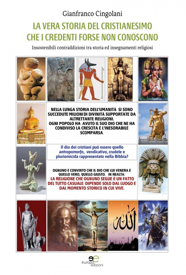 Gianfranco Cingolani presenta “La vera storia del cristianesimo che i credenti forse non conoscono”, un’ispirata trattazione sulle contraddizioni probabilmente insanabili tra storia e religione, tra razionalità e fede. Il discorso lucido e coraggioso di un autore che vuole arrivare il più vicino possibile alla verità, che desidera comprendere l’origine dell’uomo e delle credenze religiose che l’hanno condizionato sin dall’alba dei tempi. Una ricerca storica aperta all’analisi di tutte le religioni, da quelle primitive fino alle tre grandi monoteiste, con un occhio di riguardo per il cristianesimo e per le sue controverse e discordanti linee di condotta.