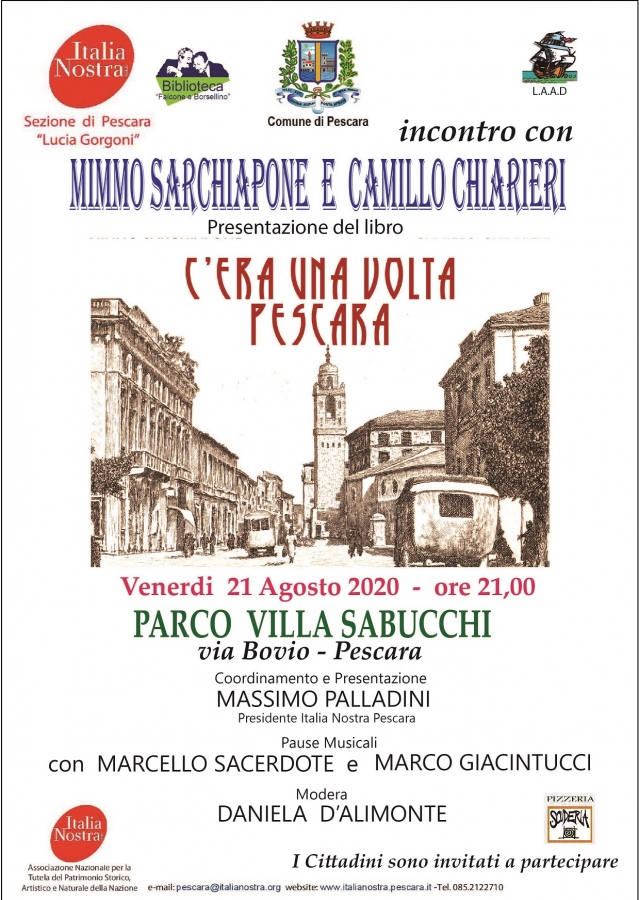 così Camillo Chiarieri ha raccontato come ha inteso scrivere un altro libro su Pescara e la sua storia. L’incontro e l’amicizia con Mimmo Sarchiapone, arista dell’incisione, ha fatto sì che la sua idea di racconto, come in un film, potesse realizzarsi in uno splendido volume dal titolo C’era una volta Pescara, che il 21 agosto ha presentato ad un folto pubblico presso il parco Villa Sabucchi di Pescara.