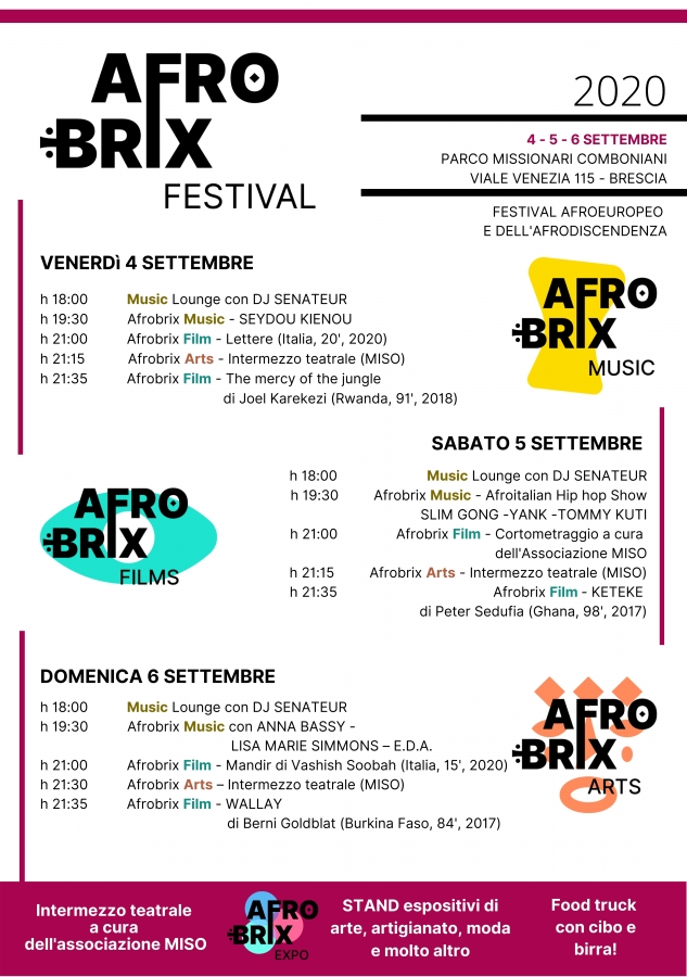 - Afrobrix Film: Proiezione di cortometraggi “made in Brescia e Italia” insieme alla realtà afrodiscendente e dei lungometraggi di cinema africano contemporaneo.