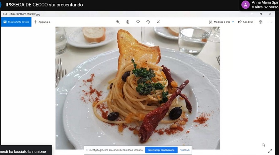 Come giusto corollario, dopo la cultura visiva ed esperienziale, il ricordo della cultura contadina che prevedeva un buon pasto da offrire a chi andava ai frantoi per la produzione dell’olio dopo la raccolta delle olive, ed ecco che, con la partecipazione della Delegazione dell’Accademia della Cucina di Pescara Aternum, sono gli spaghetti a frantoiana e meglio alla Trappitara (termine abruzzese “trappete”, ossia il frantoio) a concludere, con gusto ed aroma, un evento che ha tenuto insieme più di 100 persone che hanno partecipato online. (la ricetta è pubblicata di seguito all’articolo)