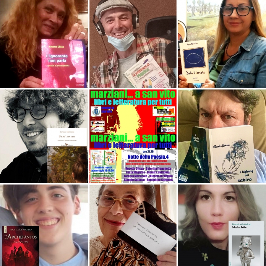 con Rosetta Clissa, Claudio Spinosa, Caterina Franchetta, Lucia Magistro, Lorenzo Marsicola, Diomira Gattafoni, Michele Di Virgilio, Beniamino Cardines. Come già con “PRESENTE!”, “MARZIANI… dal parrucchiere” e “MARZIANI… on the beach” il progetto è pensato per promuovere e sostenere la letteratura, l’editoria e gli autori-autrici abruzzesi contemporanei. Crediamo nella letteratura come portatrice di valori umani condivisi. Valori che hanno radici profonde e cuore nella cultura della relazione, del dialogo, del confronto. Valori che costruiscono l’irrinunciabile dimensione sociale a cui ogni cittadino e cittadina dovrebbe tendere.