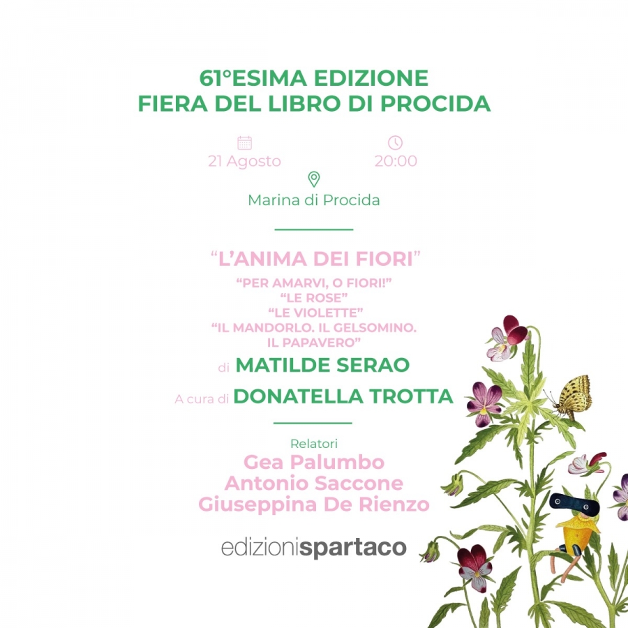 Entra nel vivo la Fiera del Libro sull’Isola di Arturo, Capitale della Cultura 2022: sabato 21 settembre alle ore 20:00, appuntamento a Marina di Procida per la presentazione de L’anima dei fiori di Matilde Serao, progetto editoriale di Spartaco edizioni in 8 volumetti, curato dalla giornalista e autrice Donatella Trotta. Dopo i saluti del Direttore della Fiera, Rino d’Orio, del sindaco Dino Ambrosino, del delegato alla Cultura del Comune Michele Assante del Leccese e dell’ex assessore comunale alla Cultura Nico Granito, con la curatrice interverranno i professori Antonio Saccone e Gea Palumbo e la scrittrice Giuseppina De Rienzo. Letture di Salvatore Guadagnuolo, interventi musicali con canzoni della Belle Epoque interpretate dalla cantante Graziella Scotto di Vettimo accompagnata alla chitarra dal Maestro Franco Tramontano.