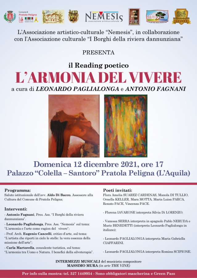 Domenica 12 dicembre, alle ore 17,00, presso il Palazzo “Colella – Santoro” di Pratola Peligna (AQ), si terrà il Reading poetico dal titolo “L’Armonia del vivere”.