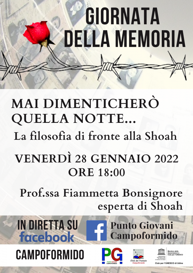 Il Punto Giovani - Campoformido e l'USE - Città del Trattato in collaborazione col Club per l'Unesco di Udine organizzano, in occasione della Giornata della Memoria, l'incontro online "Mai dimenticherò quella notte. La filosofia di fronte alla Shoah". La prof.ssa Fiammetta Bonsignore, docente di Storia e Filosofia da poco in pensione ed esperta della Shoah, ci condurrà alla scoperta degli interrogativi che grandi filosofi del Novecento come Hannah Arendt, Karl Jaspers, Emmanuel Levinas e molti altri si sono posti in seguito alla più grande tragedia che l'umanità abbia mai visto. Un momento per compiere oggi una riflessione sulla storia e comprendere come la filosofia possa aiutarci ancora adesso, a distanza di più di settant’anni da quei dolorosi eventi, a capirne la portata e a costruire un domani migliore, in cui l’immane tragedia della Shoah non possa più verificarsi.