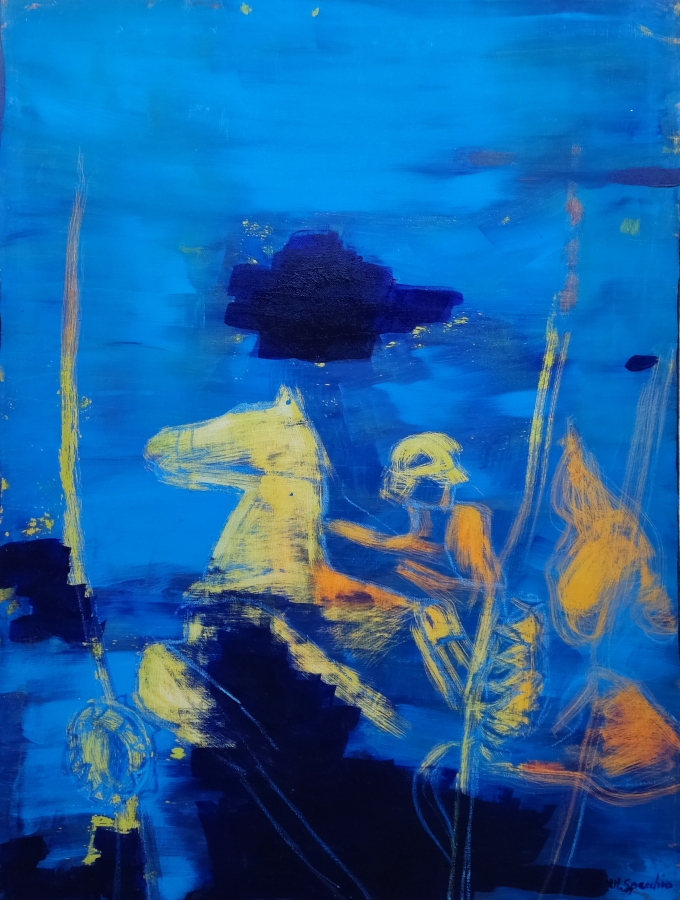Beniamino Cardines, curatore e direttore artistico: “Marcello Specchio è uno dei primissimi artisti ad aver creduto nel progetto AP/ArteProssima il che fa di lui un pioniere, un sognatore, un artista utopico. Le opere in mostra con “La guerra dell’amore” rappresentano bene una carriere artistica che da oltre quarant’anni lo vedono protagonista dell’arte contemporanea in Italia, in fondazioni e collezioni pubbliche e private. Con lui la pittura si fa rarefazione simbolo racconto onirico. I suoi quadri si presentano come suggestioni visive, scene e figure che sembrano apparire da un’altra dimensione, della bellezza, della gentilezza, del gesto pittorico assolutamente libero da schemi e convenzioni.”