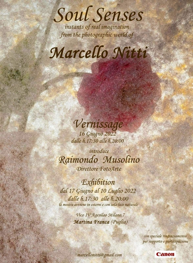 Ritorna a Martina Franca (Taranto) una mostra d’estate di fotografie di Marcello Nitti, denominata‘Soul Senses’,‘Sensazioni dell’animo’, dal 16 giugno a fine luglio. Il luogo dell'esposizione è sempre lo stesso, nei vicoli del suggestivo centro storico della dinamica cittadina pugliese, in via Agesilao Milano n.13, con l’elegante allestimento realizzato da Print Me, dove si era conclusa la scorsa estate, con successo ed interesse di pubblico, la precedente mostra. le immagini riportano squarci di vita ed oggetti della quotidianità trasfigurati da momenti di impalpabili ed irripetibile giochi di luce che ammantano di surrealità ciò che l’osservatore vede.