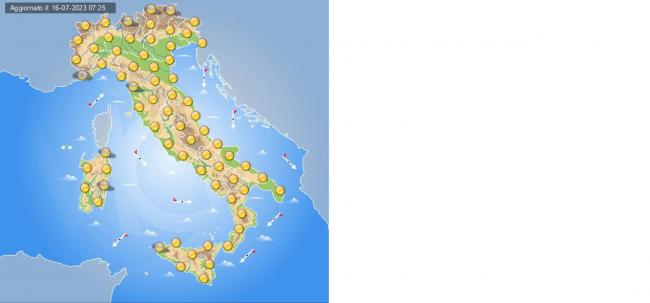 Nord: Al mattino tempo stabile su tutte le regioni con cieli sereni o poco nuvolosi ed addensamenti da nuvolosità bassa in Pianura Padana. Al pomeriggio instabilità in aumento con locali temporali su Alpi, sole prevalente altrove. In serata si rinnovano condizioni di tempo asciutto salvo residue piogge sui rilievi e sulle alte pianure di Nord-Ovest. Temperature minime stazionarie e massime in aumento, valori massimi attesi tra i 28 di Genova e i 37-38°C di Bologna e Bolzano. Venti deboli di direzione variabile. Mari poco mossi o quasi calmi.