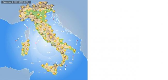 Al Nord: Al mattino tempo stabile con cieli sereni o poco nuvolosi, salvo locali fenomeni sulle Alpi orientali. Al pomeriggio instabilità in aumento con acquazzoni e temporali lungo l'arco alpino e in locale sconfinamento sulle pianure. In serata ancora instabilità con acquazzoni e temporali tra Triveneto e Lombardia, specie sui settori di pianura. Temperature minime e massime stazionarie. Venti deboli di direzione variabile. Mari poco mossi o localmente mossi.