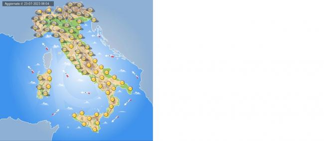 Sud e Isole: Al mattino tempo stabile con cieli soleggiati. Al pomeriggio nessuna variazione, cieli in prevalenza sereni. In serata tempo stabile con cieli sereni ovunque. Temperature minime e massime in rialzo. Venti deboli di direzione variabile. Mari poco mossi o mossi. Punte massime fino a 41 gradi a Bari, 38 a Napoli, 39 a Palermo.