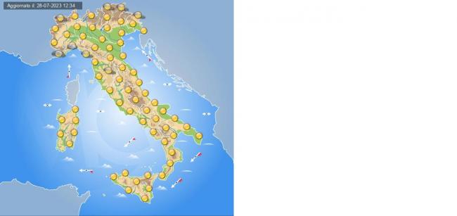 Al Nord: Al mattino tempo stabile con cieli sereni o poco nuvolosi, nuvolosità bassa sulla Liguria. Al pomeriggio acquazzoni o temporali sulle Alpi con spostamenti verso le pianure sul Piemonte, asciutto altrove. In serata la nuvolosità si sposta verso la Pianura Padana, più asciutto tra Liguria ed Emilia Romagna. Acquazzoni e temporali sparsi nella notte tra Lombardia e Triveneto. Temperature minime e massime in rialzo. Venti deboli dai quadranti orientali. Mari poco mossi o localmente mossi. Valori massimi fino a 31 gradi a Milano, 30 a Torino, 34 a Bologna