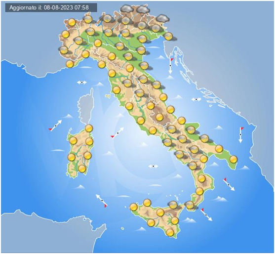 Al Nord: Al mattino tempo stabile ovunque con molte velature in transito, locali rovesci sulle Alpi orientali. Al pomeriggio maggiori schiarite al Nord-Ovest. In serata tempo stabile con cieli sereni o poco nuvolosi. Temperature minime e massime stabili o in aumento. Venti deboli di direzione variabile. Mari poco mossi o quasi calmi. Valori massimi attesi tra i 25 e i 30 gradi su tutte le città.