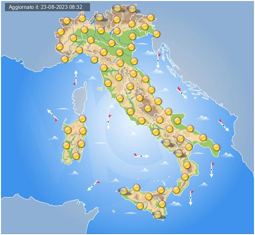 Al Nord: Al mattino tempo stabile con cieli sereni o poco nuvolosi. Al pomeriggio instabilità sui settori alpini con acquazzoni e temporali sparsi che si sposteranno verso le pianure al Nord-Ovest, soleggiato altrove. In serata tempo nella zona centro-nord di Lombardia e Piemonte con locali acquazzoni, stabile altrove con ampie schiarite. Temperature minime e massime stabili o in lieve calo. Venti deboli di direzione variabile. Mari poco mossi o quasi calmi. Valori massimi oltre i 35-37°C su gran parte delle città