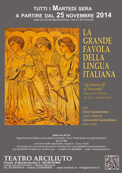 Il “c’era una volta… inizia da lì… e alla fine…?” Tutti i martedì sera, a partire dal 25 novembre, dalle ore 20.30, il Teatro Arciliuto (Piazza di Montevecchio 5 – Roma) ha il piacere di presentare un nuovo viaggio nell’Arte e nella Musica con lo Spettacolo : “La Grande Favola della Lingua Italiana”, da Federico II° al Novecento,