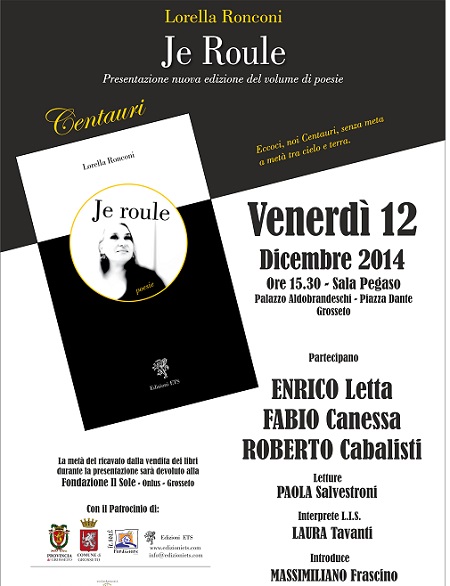 “Je roule”, la raccolta più famosa della poetessa toscana Lorella Ronconi, che vide la luce nel 2008 con la prima edizione si appresta ad una seconda uscita con la casa editrice ETS di Pisa, per incontrare le esigenze e le richieste del numeroso pubblico che nel tempo ha rivolto attenzione al volume di poesie. La nuova edizione dell'opera poetica sarà presentata a Grosseto nel pomeriggio di venerdì 12 dicembre al palazzo Aldobrandeschi, sede dell'Amministrazione provinciale grossetana. “Centauri”, questo il nome dato all'evento dal nome di una delle sue poesie più famose, vedrà la partecipazione di tre testimonial d'eccezione, tre amici della poetessa toscana del calibro di Enrico Letta, già Presidente del Consiglio, il campione internazionale di baseball Roberto Cabalisti e il critico cinematografico Fabio Canessa, che accompagneranno Lorella Ronconi nella presentazione della sua opera.“ Confesso di essere alquanto orgogliosa del mio libro – racconta Lorella Ronconi - che alla sua prima edizione ha venduto moltissime copie nelle librerie italiane, e sono un pò orgogliosa anche di me stessa, dato che come donna disabile, con grandissime difficolta' fisiche e motorie, sono riuscita, per quanto la poesia e le emozioni non sembrino andare più tanto di moda, a farmi apprezzare. Questa presentazione è merito anche della Fondazione Grosseto Cultura – continua - che con “Grosseto Scrive” mi ha dato la possibilità di realizzarla in modo migliore attraverso il premio vinto lo scorso anno.” L'autrice maremmana ha davvero buone ragioni per dirsi orgogliosa: i suoi versi sono risultati vincenti in moltissime rassegne con premi nazionali ed internazionali, da Recanati ad Abano Terme, da Acerra a Roma, da Novi Ligure a Cattolica, con gli awards della poesia. “Je roule”, la lirica dalla quale prende nome il libro, è stata inserita nelle antologie scolastiche edite da Zanichelli per la scuola media e frequenti sono gli inviti che provengono alla poetessa dalle scuole di ogni ordine, interessate a lei per la poesia contemporanea. L'anno scorso poi il libro ha varcato i confini nazionali, arrivando a Las Vegas, dove è stato tradotto in lingua inglese ed edito per gli States con il titolo I role along.