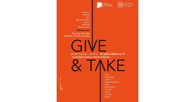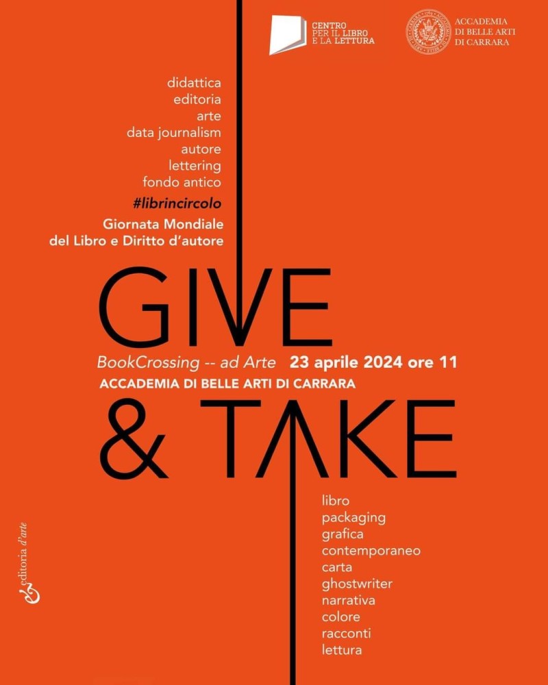 BookCrossing…ad Arte, evento organizzato dalla biblioteca dell' Accademia di Belle Arti di Carrara (MS) il 23 aprile 2024 per celebrare la Giornata Mondiale del Libro e Diritto d' Autore, istituita dall UNESCO. Sono esposti: disegni della Scuola Illustrazione e Fumetto prof.ssa Leone; tavole didascaliche del fondo antico degli studenti del prof. Malandrino; libri d'artista degli studenti di Anatomia Artistica, prof. Carchini raccolti nel catalogo della 6^ Biennale del Libro d'Artista; libri oggetto di vari materiali della prof.ssa Michelotti.
