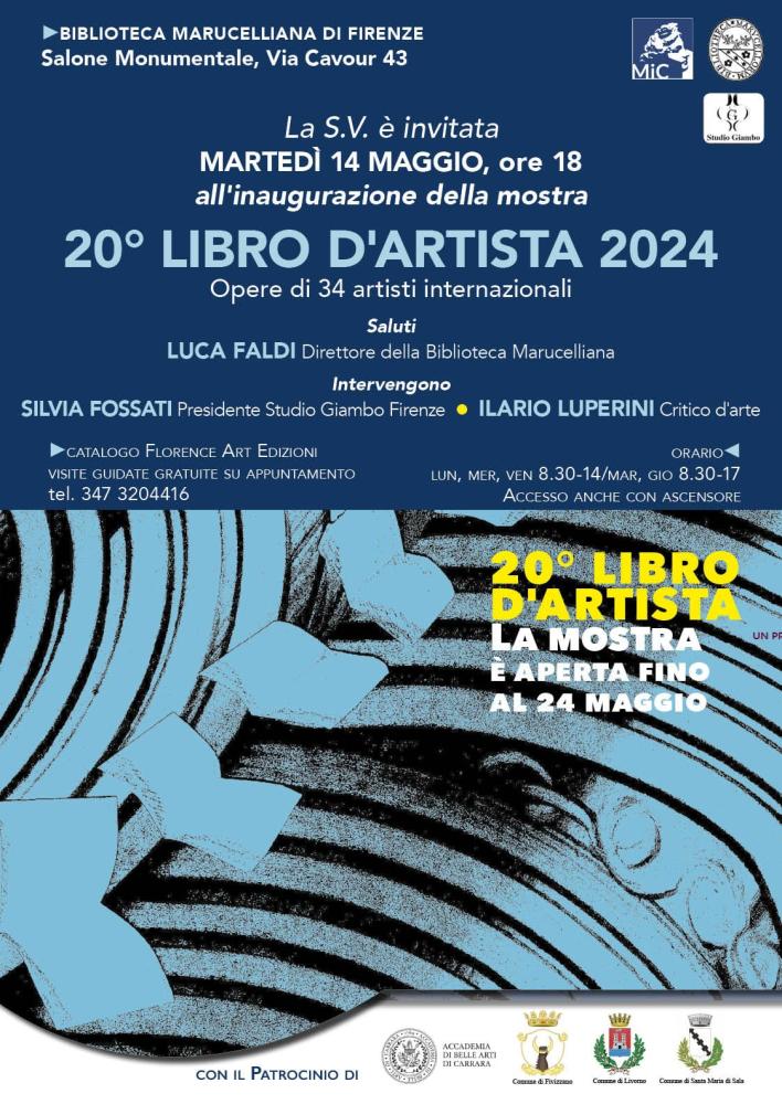 Gli studenti e docenti dell’ACCADEMIA DI BELLE ARTI DI CARRARA (MS) partecipano alla Rassegna Internazionale 20° LIBRO D’ARTISTA (1^ tappa del tour) presso BIBLIOTECA MARUCELLIANA, Salone Monumentale, Via Cavour n. 43 FIRENZE, dal 14 al 24 maggio 2024, con il patrocinio: Ministero della Cultura; Accademia di Belle Arti di Carrara (MS); Comune Santa Maria di Sala (VE); Comune di Fivizzano (MS) e Comune di Livorno, queste sono le località dove si “sposterà il Tour”. Inaugurazione ed orario d’apertura si veda la locandina della manifestazione artistica. Organizzazione Studio Giambo e presentazione della rassegna dott. Ilario Luperini, critico d’arte.