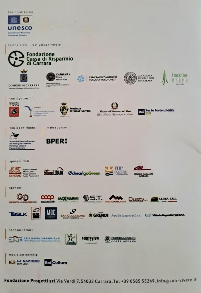 Una tela bianca vuole ricordare l'assenza, il vuoto delle artiste dell'Associazione: Anna Poli , Giò Guerri e Nina Meloni per la loro dipartita prematura. Si ringrazia Don Piero Albanesi, prete del Duomo, per la l'ospitalutà. L'evento è inserito in CON_VIVERE 2024 CARRARAFESTIVAL Patrocinio: Regione Toscana, Provincia di Massa Carrara, Comune di Carrara, Accademia di Belle Arti di Carrara, CON_VIVERE CARRARAFESTIVAL 2024, etc. (si veda la fotografia riferita al patrocinio)