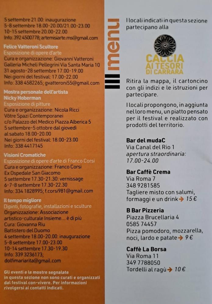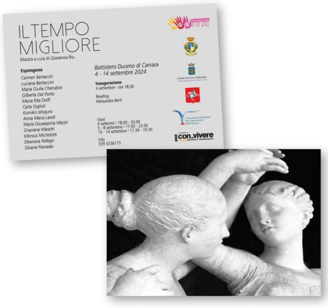 IL TEMPO MIGLIORE è il titolo della mostra d'arte a cura di Giovanna Riu dell'Associazione Artistico Culturale al Femminile INSIEME E'.....DI PIU' fondata nel 2004. Nella mostra d'arte si possono osservare dipinti, fotografie, installazioni e sculture di 13 artiste. L'evento artistico si svolge nel BATTISTERO DEL DUOMO DI CARRARA dal 4 al 14 settembre 2024.