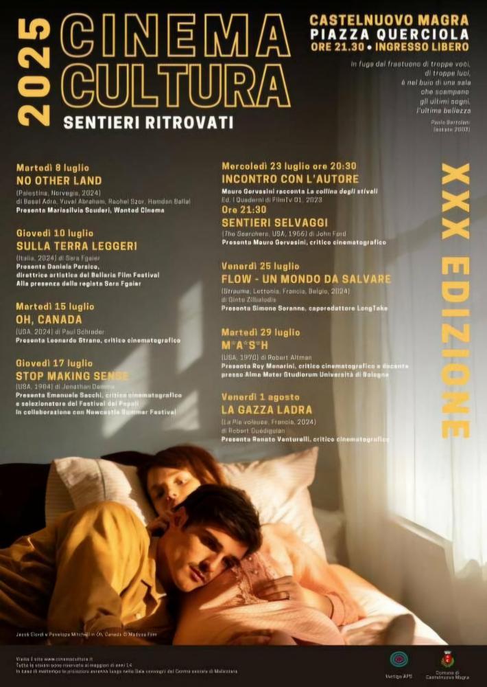 “trent’anni di proiezioni, incontri e sogni condivisi; dal 1995, grazie all’impegno costante di persone speciali, amministratori, tecnici, studiosi, critici cinematografici, registi, attori, appassionati di cinema, volontari, Castelnuovo Magra si è ritagliato un ruolo importante, ha costruito una cornice perfetta per ritrovarsi, discutere, emozionarsi e riflettere attraverso le immagini in movimento”. Il cartellone 2025 propone otto proiezioni a ingresso libero, di cui cinque film della stagione cinematografica appena conclusa e tre grandi classici. Ogni serata sarà introdotta da docenti universitari, giornalisti, direttori di festival e giovani critici, con l’obiettivo di creare un dialogo fertile tra pubblico e cultura cinematografica. Tra i titoli in programma, spiccano opere che riflettono temi attuali e profondi: No Other Land, che racconta la resistenza in Cisgiordania; Flow. Un mondo da salvare, incentrato sul futuro del pianeta; Sulla terra leggeri, un poetico affresco sui paesaggi della memoria e dell’amore perduto. Particolarmente atteso è l’appuntamento di giovedì 10 luglio, con la presenza della regista spezzina Sara Fgaier, che presenterà proprio il suo esordio “Sulla terra leggeri”, insieme a Daniela Persico, direttrice artistica del Bellaria Film Festival. Le proiezioni si terranno alle ore 21:30 in Piazza Querciola, cuore del centro storico di Castelnuovo Magra. “Cinema Cultura” non è solo una rassegna, ma una tradizione che continua a rinnovarsi, mantenendo vivo il legame tra una comunità e la settima arte. Un sentiero, ritrovato e condiviso, lungo ormai trent’anni.