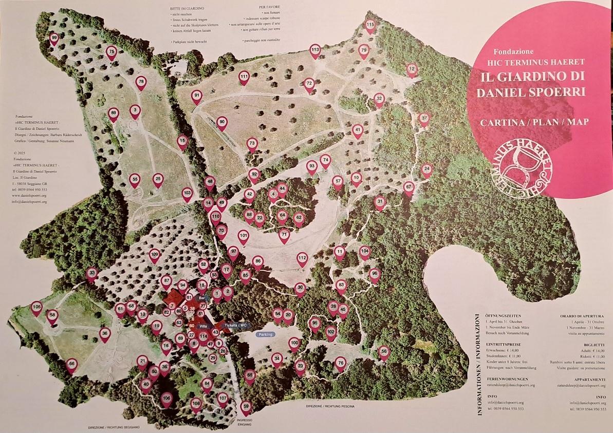 Il Giardino di Daniel Spoerri, parco di sculture a Seggiano (GR), costituisce una delle più compiute esperienze di scultura ambientale in Italia; esso nasce come estensione naturale della ricerca di Daniel Spoerri, figura centrale del Nouveau Réalisme e tra i più originali interpreti della dissoluzione dell’opera nel reale. La sua poetica, sviluppata a partire dai celebri Tableaux-pièges, trova nel paesaggio toscano un laboratorio ideale per una riflessione sul rapporto tra arte, natura e tempo. Nel Giardino, esteso su oltre sedici ettari di terreno collinare, sono dislocate più di cento installazioni realizzate da Spoerri e da numerosi artisti internazionali. Ciò che accomuna queste opere è la loro appartenenza a un principio entropico, l’arte non viene concepita come oggetto stabile, ma come organismo in trasformazione, esposto alle stesse leggi fisiche e biologiche che regolano la vita naturale; la scultura si fa evento temporale, luogo di passaggio tra creazione e dissoluzione, memoria ed oblio. In tal senso, il Giardino di Spoerri si colloca in una linea di ricerca che, dal Land Art americano alla Arte Povera italiana, ha indagato la porosità del confine tra arte e ambiente, ma lo fa attraverso un registro intimo, personale, in cui la materia dialoga con la memoria e il corpo. Il motto latino che dà titolo alla Fondazione, Hic Terminus Haeret (“Qui dimora il confine”), assume nel contesto del Giardino una valenza teorica. Il confine è qui inteso non come linea di separazione ma come zona di contatto tra umano e naturale, permanenza e mutamento, artificio e crescita organica. Daniel Spoerri realizza un luogo della soglia, in cui la scultura non domina il paesaggio ma vi si integra, fino a diventare parte di un ciclo vitale che ne minaccia costantemente la sopravvivenza. Il Giardino è dunque una riflessione sull’impermanenza dell’opera d’arte, un museo vivente che accetta la precarietà come condizione estetica e come strumento critico nei confronti dell’idea di conservazione. La poetica di Spoerri, segnata sin dagli anni sessanta dall’interesse per il quotidiano e per il gesto conviviale (Eat Art), trova a Seggiano un’estensione spaziale e simbolica. L’atto di mangiare, di condividere, di consumare diventa metafora della trasformazione della materia, ciò che nel piatto è residuo, nel Giardino diventa residuo paesaggistico, segno archeologico di un’azione trascorsa. Le opere disseminate nel terreno, tavole imbandite, corpi frammentari, altari e reliquie di banchetti configurano un teatro della memoria in cui la dimensione antropologica dell’arte viene evocata e messa in crisi. Il Giardino non è uno spazio espositivo, ma un rito in atto, un sistema simbolico che interroga la funzione stessa dell’arte come forma di sopravvivenza. A differenza di molte esperienze di Land Art che impongono al paesaggio un segno monumentale, Spoerri concepisce la natura come co-autrice; il vento, la pioggia, la vegetazione e la luce diventano elementi compositivi attivi, capaci di ridefinire costantemente l’aspetto delle opere. La patina del tempo, l’erosione, la proliferazione del muschio non sono danni, ma scritture; la natura prosegue il gesto dell’artista, trasformando la scultura in processo fenomenologico. In questa reciprocità si manifesta una delle intuizioni più profonde di Spoerri, l’arte come dispositivo che non fissa, ma accompagna il divenire. Il Giardino di Seggiano può essere letto come un museo delle rovine contemporanee; le opere, immerse nel paesaggio, appaiono spesso come resti di una civiltà scomparsa o reperti di un futuro immaginario. In questo senso, Spoerri anticipa una sensibilità postmoderna verso la materialità del tempo, il valore estetico non risiede più nella permanenza, ma nella capacità di rappresentare la trasfirmazione. Ogni scultura è un frammento che resiste solo per il tempo necessario a essere riassorbito dal contesto naturale, in un equilibrio tra apparizione e sparizione che restituisce al visitatore la consapevolezza della propria transitorietà per questo, Il Giardino di Daniel Spoerri si impone come una delle esperienze più coerenti di arte ambientale del secondo novecento europeo. Esso unisce alla componente poetica una forte valenza teorica, ridefinisce il concetto di museo, di permanenza e di opera, spostando l’attenzione dal manufatto al processo. Mentre il museo tradizionale isola e conserva, il Giardino accoglie e trasforma; laddove l’opera pretende eternità, qui essa si offre al mutamento. Spoerri costruisce così una metafisica del transitorio, un luogo in cui il tempo diventa materiale artistico e la natura non è più scenografia, ma pensiero dinamico.