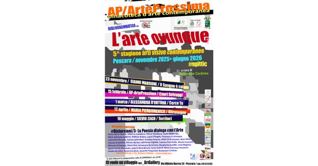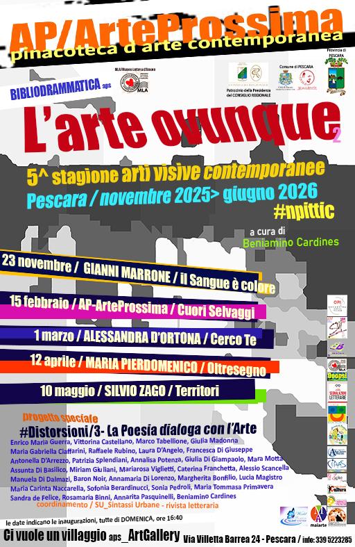 Domenica 23 novembre alle 16:40, presso la sede di “Ci vuole un Villaggio aps - Art Gallery” a Pescara (Via Villetta Barrea 24), inaugurazione della 5^ Stagione Arti Visive Contemporanee, un progetto sulla nuova pittura italiana d’oggi. Ideazione e direzione artistica a cura di Beniamino Cardines. Con il Patrocinio della Presidenza del Consiglio Regionale, della Provincia di Pescara, del Comune di Pescara. Promosso da AP/Arte Prossima, Bibliodrammatica aps, in collaborazione con SU/Sintassi Urbane – rivista letteraria, MLA/Museo Lettera d’Amore.