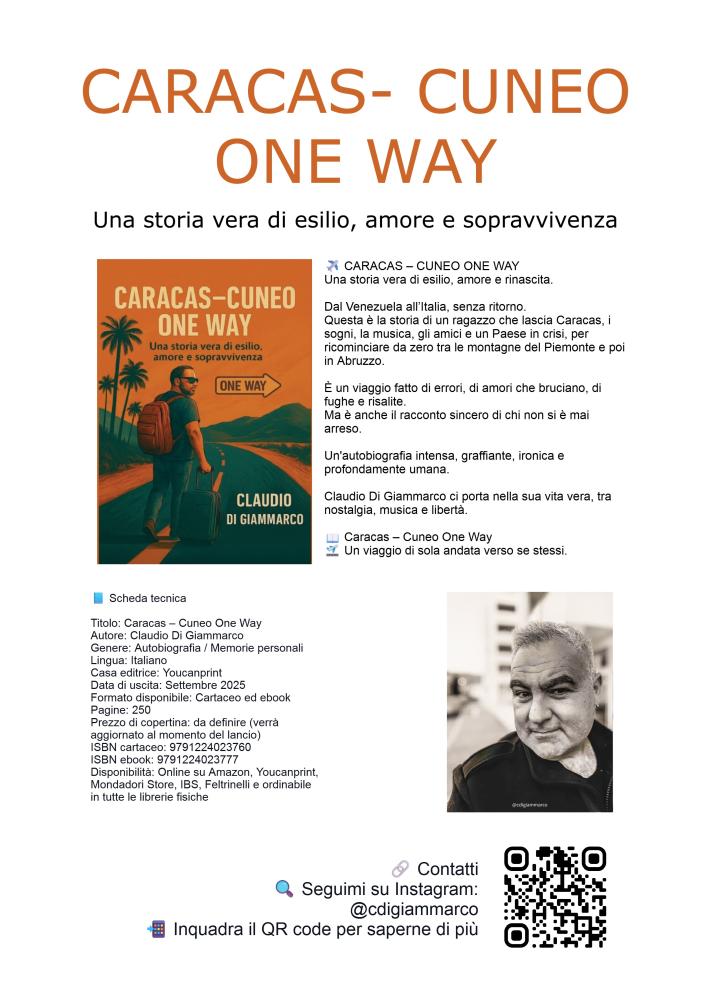 “Caracas - Cuneo One Way” è una di quelle autobiografie capaci di superare il confine del memoir per diventare testimonianza, ritratto generazionale, ricerca interiore. Claudio Di Giammarco racconta la propria storia con una sincerità che disarma: l’infanzia e l’adolescenza a Caracas, lo splendore e il caos del Venezuela, gli affetti che illuminano e le ombre che feriscono, fino alla scelta irreversibile di partire. L’autore non edulcora nulla: il dolore dell’esilio, la vertigine del cambiamento, la nostalgia che continua a mordere anche quando si è lontani. Eppure, nelle pieghe del racconto emerge un’energia potente, la stessa che muove chi decide di reinventarsi senza certezze, lasciando che la speranza faccia da bussola. Tra le montagne del Piemonte e dell’Abruzzo, Di Giammarco riscopre la possibilità di appartenersi, di costruire un’identità nuova senza rinnegare il passato. La sua scrittura è viva, mobile, piena di ritmo: si sente il respiro della città latinoamericana e il silenzio delle terre italiane, fusi in un unico percorso di trasformazione.