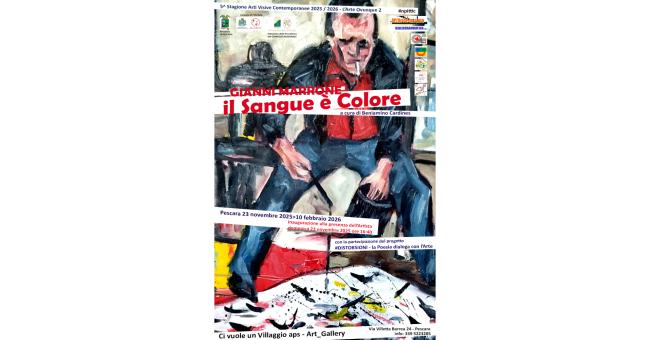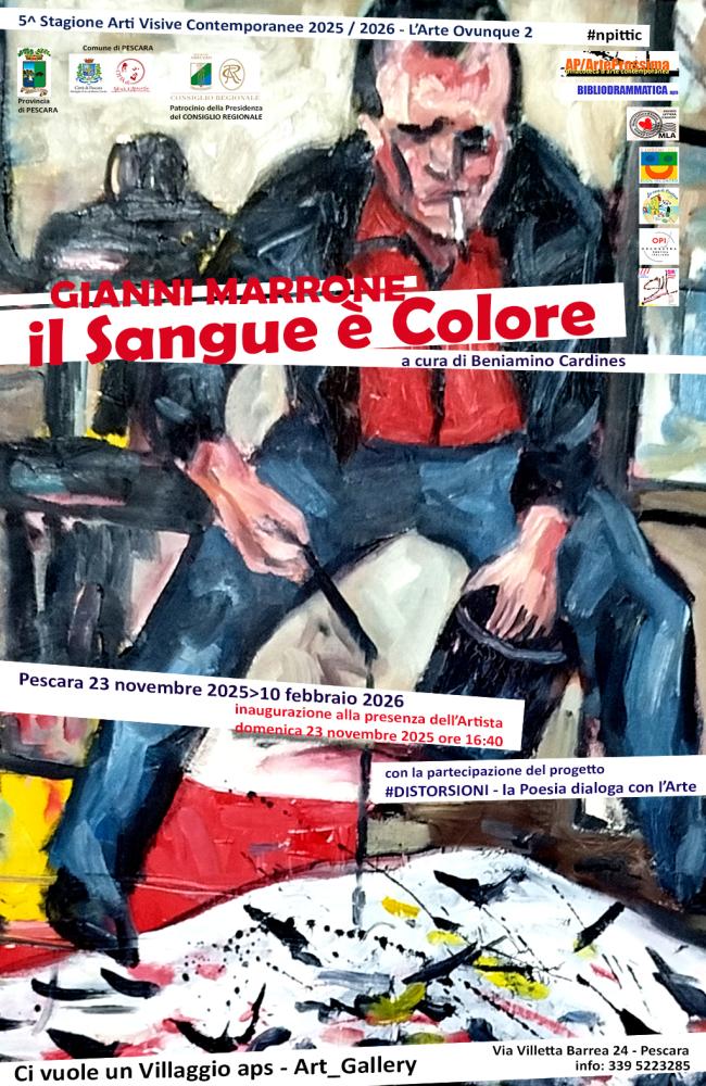 Domenica 23 novembre dalle ore 16:40, inaugurazione di “il Sangue è Colore” mostra personale di Gianni Marrone, artista abruzzese dallo straordinario talento. La mostra si terrà presso “Ci vuole un villaggio aps_ArtGallery” (Via Villetta Barrea 24 - Pescara), proseguirà fino al 10 febbraio 2026. Promossa da Bibliodrammatica aps e AP/ArteProssima progetto #npittic, direzione artistica curatoriale Beniamino Cardines, nell’ambito di “L’Arte Ovunque 2” 5^ Stagione di Arti Visive Contemporanee, col Patrocinio della Presidenza del Consiglio Regionale, Patrocinio del Comune di Pescara e della Provincia di Pescara. Un progetto di promozione scoperta e sensibilizzazione sulla nuova pittura italiana.