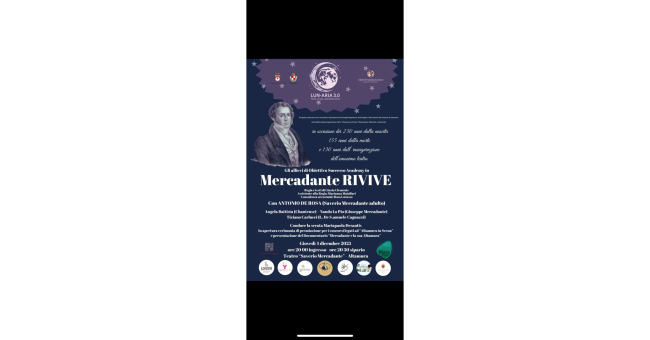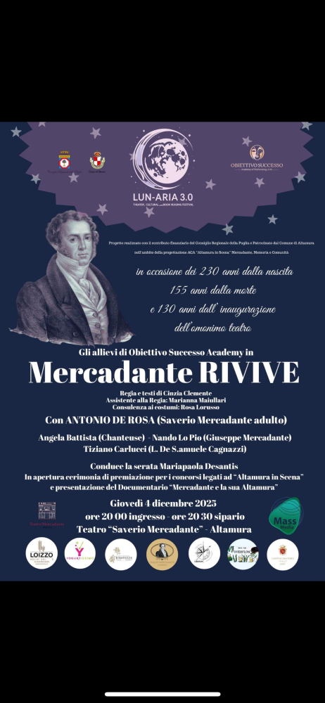 Spettacolo teatrale scritto e diretto da Cinzia Lucilla Clemente, nell’ambito del progetto “Altamura in Scena: Mercadante, Memoria e Comunità” e Lun-Aria 3.0. Progetto realizzato con il contributo finanziario del Consiglio Regionale della Puglia e Patrocinato dal Comune di Altamura
