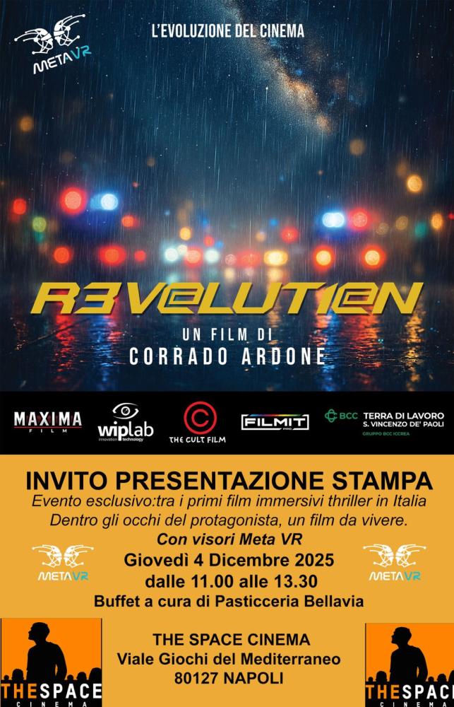 Arriva al The Space Cinema di Napoli R3V@LUT1@N, il primo film italiano di lunga durata totalmente immersivo, scritto e diretto da Corrado Ardone. Un thriller innovativo in cui lo spettatore vive l’esperienza in prima persona, indossando i panni di un uomo accusato di omicidio e sospeso tra realtà e sogno.