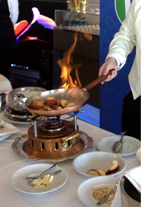 • Flambé Art: realizzazione di un dessert flambé con ricetta originale e preparazione completa in sala, compresa l’elaborazione delle decorazioni.